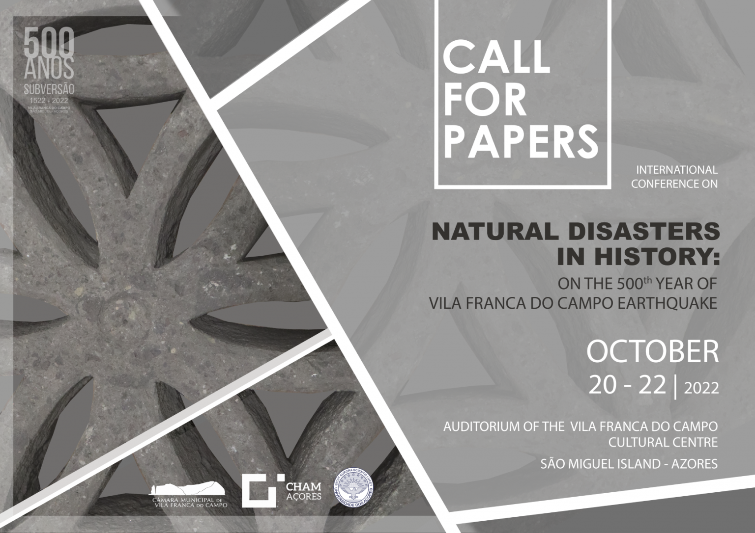 Na passagem dos 500 anos da subversão de Vila Franca do Campo (Açores), ocorrida na madrugada de 22 de outubro de 1522, a Câmara Municipal de Vila Franca do Campo e o CHAM – Açores (Centro de Humanidades) organizam um colóquio internacional com o objetivo de debater o impacto que as catástrofes naturais, de origem diversa, tiveram nas comunidades humanas do passado. Aceda aqui a toda a informação sobre o mesmo.